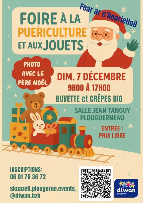 Exposants recherchés ! 🎁 Foar ar bugaleaj hag ar c’hoarielloù La grande Foire à la Puériculture & aux Jouets arrive à Plouguerneau. ✨ C’est LE rendez-vous pour vider vos placards avant Noël et donner une seconde vie aux affaires de vos enfants (jouets, vêtements, livres, matériel de puériculture, etc.)… tout en soutenant l’école Diwan ! 🔖 Tarifs tout doux : ➡️ 4 €/m (tables et chaises fournies) ➡️ 1,5 € le portant (non fourni) ➡️ 1 crêpe sucrée OFFERTE à chaque exposant 🍯🥞 🎅 Le Père Noël sera présent pour ravir petits et grands, et une buvette gourmande (crêpes salées/sucrées) régalera tout le monde. ⚡️ Attention : les places partent vite, ne tardez pas à réserver ! 📞 06 01 76 36 72 📧 skoazell.plougerne.events@diwan.bzh 💻 Réservation en ligne https://www.helloasso.com/associations/kuzul-skoazell-diwan-plougerne/evenements/foire-puericulture-et-jouets-7-dec-2025?fbclid=IwY2xjawOOlSpleHRuA2FlbQIxMABzcnRjBmFwcF9pZBAyMjIwMzkxNzg4MjAwODkyAAEewm95q0-AbwwWTxJYKZBCpIPDGJ2CJSnzSqkmbiz1_GUuqrzZUwOSuXd4ovU_aem_ZnVJM2WM5gkbfdMFfTIZhg