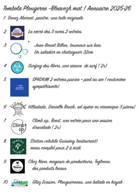 La tombola Bloavezh Mat vient nourrir le financement de l’école Diwan de Plouguerneau. Nous sommes heureuses de pouvoir mettre en avant une partie des richesses paysannes, artisanales, sportives et culturelles locales. Nous remercions très chaleureusement l’ensemble des donateurs et donatrices, professionnel.le.s et sympatisan.e.s Voici la liste complète des lots : 1 Denez Abernot, peintre : une toile 2 La récré des 3 curés à Milizac : 2 entrées 3 Jean-benoît Billon, tourneur sur bois : un saladier en châtaignier 32cm 4 Surfing des Abers à Plouguerneau : une séance se surf (x2) 5 Spadium : 2 entrées gratuites + pied au sec (sympathisante) 6 Villadada, Danielle Bruck : set apéro en céramique (3 pièces) 7 Clim Up, Brest : une entrée pour une session d'escalade (x2) 8 Restaurant Station Volubile à Guissény : menu complet pour 2 à midi 9 Chez Nano, magasin de producteurs, Tréglonou : des produits locaux 10 Glaz Evasion, Plouguerneau : une balade en kayak 11 Pioka, atelier céramique, Plouguerneau : un atelier 12 Ecurie des Abers, centre équestre de Lannilis : balade en Shetlands pour les 4 - 9 ans (x2) et balade à cheval pour les 4 - 10 ans (x2) 13 Joëlle Colombani, pédagogue à Guissény : séance de technique FM Alexander 14 Un instant coiffure à Guissény : shampoing coupe brushing 15 Bar ha Gwin à Plouguerneau : un panier garni 16 Hoalen à Plouguerneau : cadeau de la boutique 17 Huîtres Legris à Plouguerneau : bourriche d'huîtres numéro 3 18 Florinum à Plouguerneau : un hydrolat Menthe 19 Biocoop Prim'vert à Lesneven : un panier garni 20 Boulangerie Tour de mains à Plouguerneau : un gâteau pour 8 personnes 21 Librairie St Christophe à Lesneven : un cartable + une trousse pleine + stickers + 2 livres 22 Liliar'mor bijouterie à Plouguerneau : un bon d'achat de 30€ 23 Le potager des Embruns à Guissény : un panier de légumes frais 24 Demande-moi la lune à Plouguerneau : un jeu + deux carnets + une trousse 25 Café céramique à Brest : un bon d'achat de 15€ 26 Le grand panier bio à Lannilis : un bon d'achat de 30€ 27 Ti an Aberioù Maison des Abers à Saint-Pabu : une sortie nature en famille (2 adultes et 2 enfants) 28 Institut Gwendoline à Plouguerneau : un cadeau de la boutique 29 Côté mer à Plouguerneau : un panier garni 30 Carré de sable à Lannilis : un cadeau de la boutique 31 Les caves Adam : un cadeau de la boutique 32 Kiriel Floch Appro jardinerie à Lannilis : un bon d'achat de 20€ 33 Office de Tourisme de Plouguerneau : un cadeau de la boutique 34 Fun Park Acrobranche à Dirinon : une réduction de 5€ (x3) 35 Kuzul Skoazell Diwan Plougerne : Kig ha Farz et Veg ha Farz 2 parts adulte et 1 part enfant 36 Fleuriste La Tulipe Noire à Lannilis : une plante 37 Kuzul Skoazell Diwan Plougerne : Une pizza au choix lors de la fest ar Beo (le 18 mai 2026) 38 Villadada, Danielle Bruck : un bijou 39 Une couturière sympathisante : Chouchous (x3) 40 Une couturière sympathisante : un sac de voyage avec poche en velours 41 Une couturière sympathisante : un sac en toile de bateau 42 Une couturière sympathisante : Sacs bananes (x2) 43 Une couturière sympathisante : un gilet réversible taille 5 ans (style peau de mouton en coton) 44 Une couturière sympathisante : grande trousse imperméable /plage (x2) 45 Une couturière sympathisante : Lot de 6 lingettes de toilettes (x2) 46 Une couturière sympathisante : lot de 4 serviettes de table (2 petites + 2 grandes ) (x2) 47 Une sympathisante : un abat-jour 48 Une couturière sympathisante : une trousse de toilette nomade + un sac en bandoulière + chiffon à lunettes